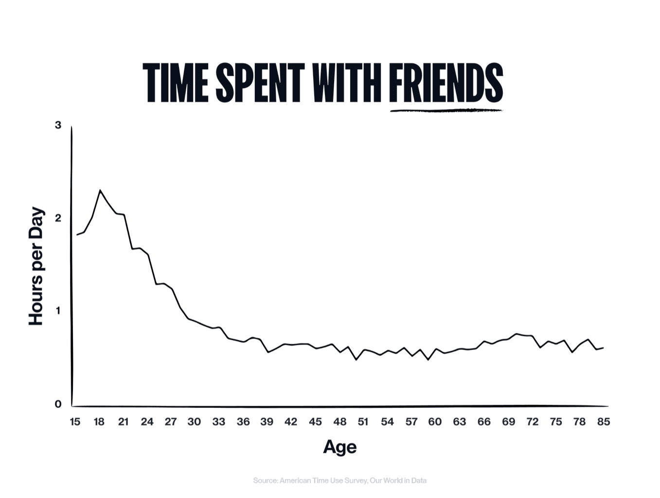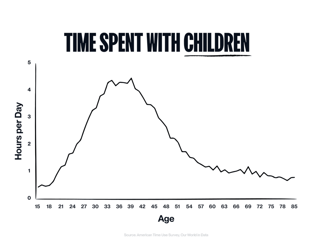 It can be instructive to look more closely at how we spend the finite time we do have. You probably don’t look to the American Time Use Survey for guidance on how to approach life, but data has an uncanny ability to distill certain realities. Collected by the US Bureau of Labor Statistics and as its name suggests, the survey measures how Americans spend their time on various activities of daily life. More intriguing to me, though, is that the survey also captures who we spend time with, and how the amount of time spent with those people changes over the years. In a bit of inspired deconstruction, writer Sahil Bloom breaks out the data on who we spend time with into six individual line graphs; the three that spoke to me most are below: