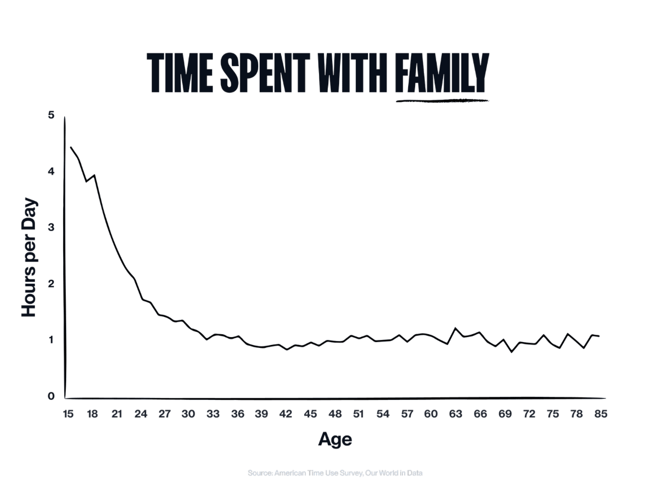 We likely know from our own experience that as we reach our early twenties, the time we spend with our parents, siblings, and other family members drops significantly compared to prior years. But seeing the precipitous drop in the graph really drives the point home.